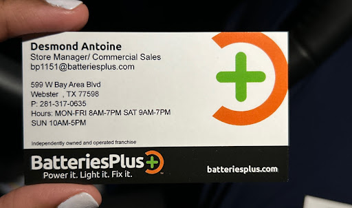 Read moreDuring a 500 mile trip to Galveston Texas I discovered the battery bank in my RV had gone bad. I had no power to my house and was desperate to find new batteries before my old ones caught fire or just kept stinking up the RV. The only option was Batteries plus in Webster. I was reluctant because my previous experience in Oklahoma (Edmond) was so bad I stopped using the company because no one had any knowledge of building battery banks for RV’s. But to my relief and surprise Desmond the store manager (599 W Bay Area blvd Webster Tx)was a wealth of knowledge and helped me choose the very best replacement batteries to optimize my 400 watt solar system! I’m now running at full capacity and with a safe set up. As a DIYer I love to pick the brains of professionals who are knowledgeable and able to explain the intricate details especially when dealing with electrical issues. He was also able to refer me to a electrical company that had the right conduit connectors to safely re crimp my 2guage battery cables that came loose as we were leaving the store.Thanks Desmond! I’ll be calling you all the way from Edmond OK if I ever have...