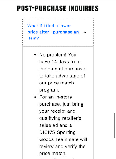 This store has a very nice selection of items, and everything is always organized. I love the shopping experience. Unfortunately, their customer service is very lacking. I purchased clothes 3 days ago from them, and found out today the same clothes I bought are on sale. That is no one’s fault at all. But per Dick’s website it says, if you find a lower price after purchase: “No problem! You have 14 days from the date of purchase to take advantage of our price match program. For an in-store purchase, just bring your receipt and qualifying retailer's sales ad and a DICK'S Sporting Goods Teammate will review and verify the price match.” I speak with the manager and he is like, yeah we can price match but you have to bring all the clothes you bought back in so we can complete the match. I had already removed all the tags and put up the clothes I purchased, why would I have to do that? When I advised him that none of the clothes have tags, he insisted I still have to bring the clothes I purchased because it is their store policy. But their website doesn’t say I have to bring anything but a receipt to price match. To me, I’m like it’s $30 bucks on a purchase of $250, and I made another $200 purchase that same evening. Like why give such a hard time on $30? And you might say the same to me, it’s $30 bucks right but it’s about principle I guess. This whole scenario didn’t sit...