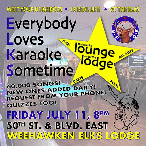 All are welcome to join us on Boulevard East (at 50th St.) Friday nights down in the Member’s Grille Room (on some Fridays, like this July 11, it becomes “The Karaoke Lounge Under The Lodge” and I become your KJ: Karaoke Jockey) to find out what it means to find friends, purpose and a sense of belonging right in your own backyard (with what Elks from other lodges acknowledge has the “…best view of any lodge in the country!”).