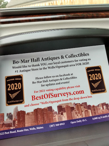 Read moreThis past weekend my two brothers and I along with two nephews, one niece and a husband met in Wells Beach for a little reunion. Because we are a family who enjoys competition, challenges, and creative sport, I had planned a little scavenger hunt and used Bo-Mar Hall as the location! While I had never been before, Bo-Mar was everything I had hoped it would be and so much more! We descended upon the place (without permission or warning), and our 3 teams of 2 people each scoured the space for 60 minutes attempting to find treasures from a long randomized list of eclectic items I had provided each team (and with a budget of only $40 cash)! Oh - I forgot to mention we were all wearing silly wigs throughout the experience - another detail designed to embarrass the heartiest soul! The staff were absolutely marvelous, especially Susan (who kinda got "into it" with us and helped guide our teams in the right direction for some of the more obscure items!). This place is amazing, and we all agreed we would return at some future point when we could shop for what we actually wanted instead of chasing items on a list! Thank you Susan, Tom and all the staff who made our family adventure so successful! You guys are terrific and very good sports, and your store is a wonderland...