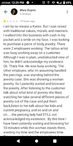 As for my experience I too was not ACKNOWLEDGED which was why I was going to file a review. It's not the quality of art the business delivers nor the selection. It's was simple lack of customer service that was not provided which by the way is a simple training issue as the owner. However @ the owner who has failed to grasp the concept stated has only shown he leads by example as the owner by being overly aggressive to negative feedback. AGAIN @ the owner complete failure of customer service. Point proven...so yes like that sign that hangs on the (right side wall in the middle before you reach the display of belly piercings)...since integrity isn't the owners strong suit. It's states can't compete with others prices for their work is their worth. Well @ the owner is your job as the owner your work? So your response to these things are your worth.. 1 stars are equally important as 5 stars ( Good luck removing your ignorance from the public eye) Fyi also I wonder how the lady that entered the shop briefly before I left experience went because she too was unacknowledged the entire time I was present. (Unless owner wants to says she never...