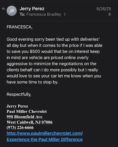Ā Ā Ā Read moreThis is the worst experience with a car dealership Ive ever had. I typically donāt go to car dealerships because of the astronomical prices they charge. I brought my car in because the check engine light was on and I wanted to ensure my extended warranty company would honor repairs. I dropped my car off 7:00am Wednesday, April 30, 2025. They looked at it and found it was the catalytic converter and want $6000 for the repair because my warranty company wouldnāt cover it; I declined this repair. They also found a leak in my transfer case. I did not purchase the car here nor did I purchase my extended warranty here. I provided all information for my extended warranty company with hopes they would cover most of the bill. I was informed on Thursday, May 1, 2025 that my warranty company would provide a used transfer case because they would not cover the cost of a new one, not Paul Millers fault. I agreed to the repair with the used part. My dealings were with Jussely Pimentel. The rudest and most condescending ākidā Ive ever had the misfortune to deal with. This kid has no people skills and quite frankly doesnāt know her job. I was told, by her, the part would be in Monday May 5, 2025 and āitās a big job and will take 12 hours to completeā. I called Monday to see if the part came in and was told yes, my cars on the lift and they were working on it. I asked if she could give me a rough estimate as to how much it would cost, she said around $1200; it was $1600. When asked how long before its done she regurgitated the same answer given previously, ā12 hours, you have to understand itās a big job and takes timeā. Through all this, Im stranded without a car and no way to get to work. I call back Wednesday May 7, 2025 and was told again āyou have to understand itās a big job and takes timeā. I asked if she could give me an estimate as to when it should be done and she stated āyour car wont be ready until Tuesday or Wednesday of next weekā (5/13 or 5/14). I had to scramble to find transportation so I can get to work. I get a text Thursday, May 8, 2025 at 12:30pm stating that my cars was ready for pick up. Ive never had such a run around of misinformation when dealing with car repairs. Of course, when I picked up the car I did not deal...