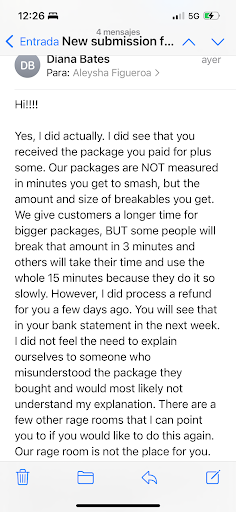 My husband got me this as a birthday present, I was really looking forward to it but I have to say it was not worth what they charge you. I donât see how they can justify those prices. The full body suit I put on had no real protection for my feet, the feet part was completely ripped, at one point I had a piece of glass go through my shoe. You basically wear the equivalent of garden gloves, which are not much protection, my husband cut his finger with glass through them. The rooms are entirely too small , you smashed something and glass flew everywhere, I had glass falling on my head. Needless to say I did not feel protected at all. Now I will say they gave you a lot to break, but when we got in the room a huge chunk of the room was taken up by already damaged items , a couple big flat screen tvs and it made the room even smaller. There was no safe place to stand where you wouldnât be stepping on glass, which I would have been fine with if I wasnât wearing cheap PPE. I feel like for what they charge you should have a completely clean room to start, and they were not busy at all so I didnât see any reason why this couldnât have been done. I mean $80 per person, really? Not to mention you have to pay an extra 10 if you want a large item. Save your money and donât waste it here. It...