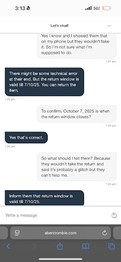 I came in to do an online return, I processed it online and was told I had until October 7 before my return window closed. The worker I first spoke to said it was not showing up on his end and that it was outside of the window, despite on the order details saying I had until October 7. He told me to contact customer service because it may be a glitch but he canāt do anything.
