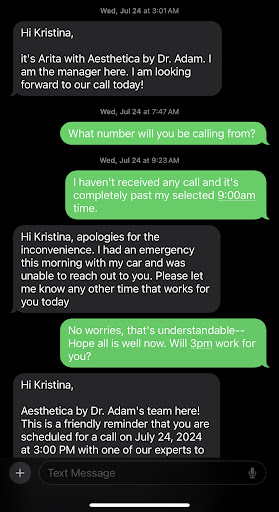 I have to clarify that Dr Adam did try to redeem after the first incident. But the clinic decided to move my appointment that I booked 3 months in advance and couldnāt book me for another 2 weeks? This is not the first time this happened. I was told twice Iād be contacted and nothing. My appointment came and went. I told them I am no longer interested. Why would I pay such high prices for nothing but problems