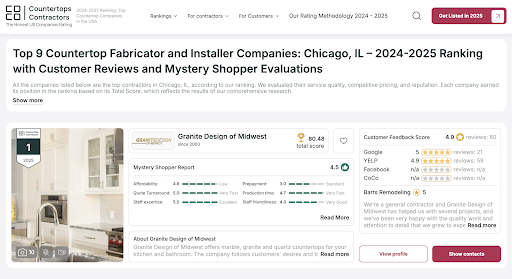 The Countertops Contractors Ranking team is pleased to recommend Granite Design of Midwest as one of the highest-rated companies in the United States according to the 2024–2025 national ranking of stone countertop fabrication and installation companies. Based on our independent evaluation, the company ranked #24 nationwide, took the #1 spot in Illinois, as well as the #1 position in Chicago. In our mystery shopper research, Granite Design of Midwest demonstrated a high level of customer service, professional consultations, and one of the fastest turnaround times in Illinois for delivering a full project estimate. The company offers a wide selection of quartz and granite, while its in-house showroom and fabrication facilities allow full control of product quality at every stage. In terms of pricing, Granite Design of Midwest is rated in the Low price category among top-performing companies in the region. The company requires a 50% upfront payment (standard for the industry) and typically completes fabrication in about 10 days, a schedule that aligns with market norms. Taking all results into account, in the opinion of the Countertops Contractors Ranking team, Granite Design of Midwest is a reliable and transparent partner for homeowners seeking quality stone countertop fabrication and installation services in Illinois and beyond. Sincerely, The Countertops...