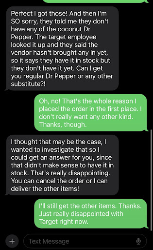 The woman on the phone was very nice. I would give her 5 stars. But between the cashier, the carts in the way of leaving the checkout, and having to return to the Target the next day to get the same items (one of which was then out of stock and another which had increased in price overnight...)...2 stars...