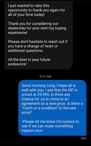 I can go on and on but lastly your saleswoman had given her cell the night before in order to get us in the showroom the next morning ( when I found out it was in the deer accident ) and when I followed up BY TEXT that there was a follow up question I had SHE CALLED ME when I said it can wait till the next day.