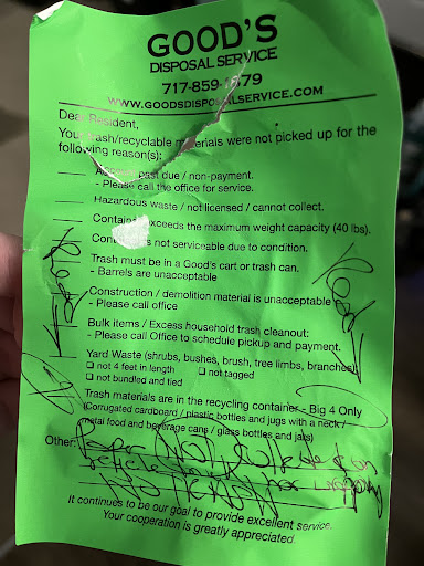 Read moreWe switched to this service after a horrible experience with Eagle not picking up our trash or recycling, but these people do not know how to pick up recycling either apparently. When we switched over, we were never informed about the big four so the first time we got the green sticker was because of lack of communication. We dug through our recycling to remove the pieces of plastic that we were misinformed about for the following week. This is now the third week in a row that they have not collected our recycling because of the big four that they wrote down. One tiny sliver of plastic was found at the bottom of our bin that they so meticulously dug through, and slapped that beautifully written sticker on top of our recycling. I do not know how these people passed kindergarten with how bad that handwriting is. For the amount of time that it took for them to dig through our bin, write that sticker, and slap it directly on top of that bad boy they could’ve collected three other houses recycling’s in the meantime. I am extremely disappointed especially after reading all these reviews that everybody raved about them, but now I’m starting to see a pattern of other people not getting the recycling taken, and for them to just rummage around, place the bin back haphazardly, and slap that wonderful hand written (with the BEST grammar I’ve ever seen in my entire life) on top of their bins as well. My dog could’ve written a better note. Everything is going in...