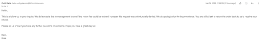 Read moreVery disappointing costumer service. I have bought for almost $1,300 and wanted to return one item, they want to charge $10.99 return fee, I asked for a gift receipt for one item they said sorry we don't have a gift receipt, so I asked the lady what will happen if someone wants to exchange it, she said, she can provide us with the order number, however, the exchange would be sent to the shipping address on the order, not to her!!!!! and return window is just 14 days..... really?? horrible costumer service, I found out the founder is Iranian , this is exactly what 3rd world countries do and she...