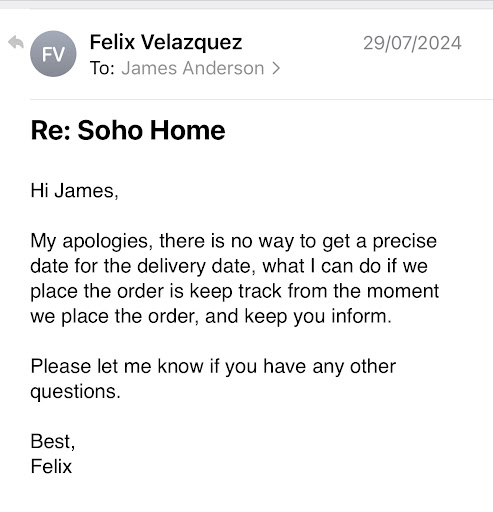 Read moreSoho Home Melrose has been a consistently disappointing retail experience. Despite spending around $30k with Soho Home in the past month, I always feel unwelcome when visiting the store. The staff seem disengaged, and their assistance feels reluctant. For example, when placing a large order last month, I spoke to Felix about the delivery timeline via email. Unfortunately, he couldn’t provide any more information than what I could already see online. He offered to keep me updated as and when the items were available for dispatch, to which I responded would be greatly appreciated, but I never heard back. Today, when I called to request a swatch for a rug I’m considering, I was placed on hold and then abruptly disconnected. After a couple more attempts, I finally got through, yet there was no apology and I was told, "You can just...