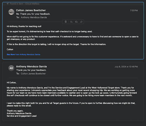 Read moreSo I went to this target being new to the neighborhood thinking this is probably gonna be a good store with good customer service. I was right about the store but the 3 employees that helped me were not at all what I'd expect from target and especially in this area. Did my small shopping, went to wait at the check out, and a lady named Rossa took me and told me she´d help me. She also said to me "let's start u up on a new account. Come over here." I really did want to open some sort of discount membership with target, being that I was probably going to come here often. She took me to another register with another female employee and asked for my ID. Before giving it to her I asked if I open it today will I get the discount? They both answered yes. I gave it to both of them then a rather long sign up process was brought up on the atm thingy. And in the middle of filling it out, I noticed it said that I am applying for a new credit card. I didn't ask for this, nor did any of them tell me this. I then told her I don't need one, and that I don't have any credit or an income right now. I came in with a backpack full of patches, torn sleeves, and a skateboard. Do I really look like I need a credit card?? Then while I'm filling out the rest of the credit card sign up the two female employees begin to speak Spanish to one another in their normal voice and are gossiping about another employee getting a raise and how they didn't. Assuming that I don't speak Spanish. Very low class. Then I pay thinking it's over and I didn't even get the discount!!! Nor did I find out if I qualify or not. Which I won't. WORST PART OF ALL was Rossa then told me that she was gonna set me up with yet another employee for a "quick survey". Horrible experience. Oh, and the deodorant I got was 10 bucks, it said 4 and some change on the price, now I have to go back and...