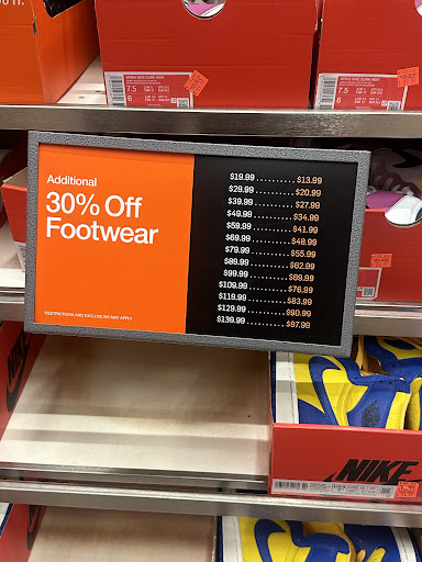 Read moreI like the Nike factory store because I can order things online then return them there if I don't like them. I do like to go to this particular location to see what they have on their clearance rack because you can sometimes get a really good deal on some great shoes. The only reason I didn't put five stars on here is because I buy a lot of shoes I'm kind of a shoe person you might say I have about 30 pairs of shoes and I wear different shoes for different occasions. I recently purchased some walking shoes just for going walking which I don't do a ton of but sometimes just get a wild hair to go walk 5 mi just for fun and these shoes are not very comfortable unfortunately I've already had them over 60 days so I asked them if I could return them and they told me they could not do anything for me.. The shoes still look brand new and have really only been used about an hour of use so I can't understand why they wouldn't return them but they said they wouldn't so it kind of has left a jaded feeling with me about the shoes and apparently if I buy new shoes I need to try them quite a bit for a minute before I put them up in my closet and only use them every other month or so. It's definitely a learning experience for me to pay $100 for a pair of shoes and then now I don't know what to do with them So probably end up just donating them but it is what it is for the most part Nike makes a really good shoes in I'm very happy...