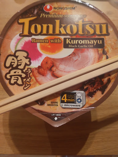 When I came in the store was getting a delivery. I got to try a brand new product on the shelf, Nongshim Tonkotsu ramen cup with black garlic oil. So good~! The garlic oil goes so well in the soup, perfect match. It even has sliced garlic inside. For just under $4 it is a very good...