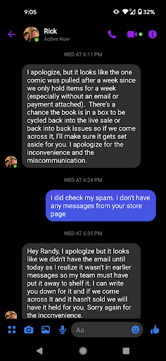 Read moreI edited this review I was extremely upset initially because of how the exchange happened between me and 1 staff rep (don’t know his name) in short I felt I was not treated well and when I asked my brother to help me out in selling my comics he did the same this I did also spoke to a guy and was told to come on in with no description of the comics I called about giving initially and I was offended and upset I didn’t get the same response even though my story was completely the same as how my brother explained and I even gave details on what I had with me I was turned away and told to send an email which never got read either way I was upset about it because my brother was able to get the outcome that I wanted without his help I probably wouldn’t have sold them right away. I saw your response to my message and appreciate the sentiment but you need to extend the same grace to everyone! I was the one selling the comics why was it so difficult I had to ask another human being for help and we did the same exact thing called in spoke to a guy and got completely different responses anyways that’s for reading and taking the time to see it from my point of view this was a 1star and now I’ll...