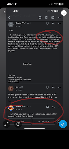After Jim agreeing for an extra charge which ended up being a total of $210 to pick up the dryer fix it and bring it back. The night before They (fixed) dryer was supposed to be dropped off, at 7:30pm at night JIM WEST emailed me stating that they charged me incorrectly? and due to their mistake my dryer would not be dropped off on the schedule time. Seriously !!!!! So at 7:30 at night, I had to pay them again to get the machine dropped off on the time that I scheduled it for and they agreed to and set up.