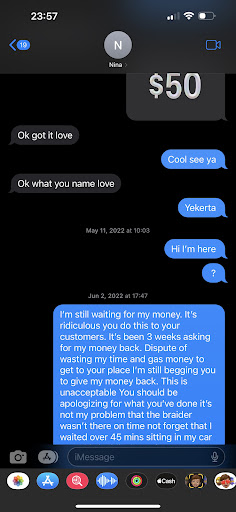 Got there on time they told me my braider had emergency and she won’t be here until 2pm(my appointment was at11am, mind you they didn’t tell me this till I got there and makes me wait over 45 mins) Nina apologized and agreed on returning my deposit. Not only I wasted my time and gas money without getting the service, Nina didn’t give me back my money. It’s been 3 weeks now. I’ve been calling her my calls go straight to mail box this is insane. You can’t do people dirty and stay on business. If you value your time and money avoid this place...