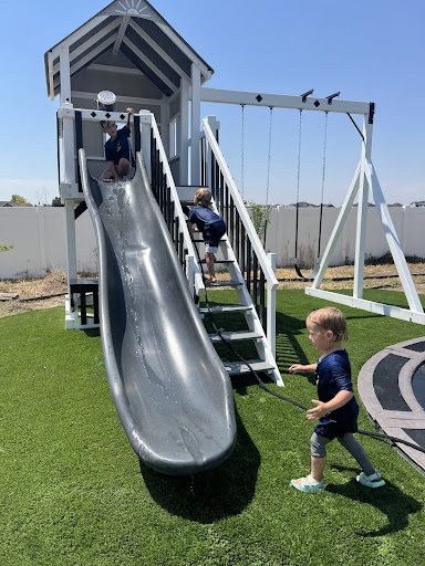 Read morePlayground of our dreams! Not only is it resilient but it's beautifully designed. We had a complicated spot in our yard to place it in and went through multiple iterations trying to make it fit without it being too small, exceeding our budget, or too big. There was another company who sells similar playground (to remain unnamed) that gave up on us because they said it was just too complex. King swings (specifically Crystal) stuck with us despite the complication. They understood it was complicated, but also understood it was a big investment and that we wanted to be sure about the decision. When the time came to install the communication was top notch. They came out when they said they would. The install crew (Raymond, Daniel, and Isaiah) were professional and respectful. Our backyard was difficult to navigate as we had some decorative metal edging we had just put in, but they found a way to navigate the towers without it ruining our edging. We had concerns about the our space not being level and the blocking to make it level. We were concerned the blocking would make it look weird, but we made a suggestion to cut the blocks to exactly the size needed and paint them green to match our turf. They were supportive of that idea and even whipped out some green spray paint! I quickly cut the blocks to size, sprayed them and they took care of the rest. There was a bump in the slide after installing, but they immediately notified us that if the bump didn't disappear in a week they would send out a new slide. The bump wasn't their fault as it was a result of the heat when transporting. We hope the bump will come out, but if it doesn't, we know they will take care of it. Overall, top notch playground and customer service. Don't pay a playground from Costco that will look good for a year! Invest in something that will last a lifetime and that you don't have spend an entire weekend putting together yourself! Picture of our kids using a hose to turn it into a waterslide...