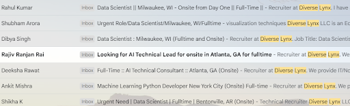 I want contacted by a Kamlesh Kumar Yadav, a "resource Manager" with Diverse Lynx, he's been with them since March 2023 according to LinkedIn. According to LinkedIn he works On-Site, at Diverse Lynx's offices in New Jersey.