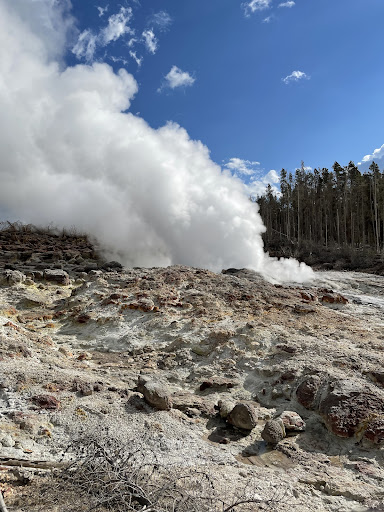 In addition to steam and water, the major eruptions blow out a lot of sand, mud, and rocks. I read that up to 700 cubic feet of debris can be produced from a single major eruptions. Trees have often been snapped by the rocks thrown out. Definitely a giant among geysers!