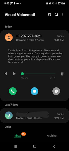 The next morning i got a voice-mail from Ryan (pictured) it is my voice-mail transcribed and the messed up line is "I saw your little display on Facebook (meaning my factual review of the situation). This is just a really odd and uncomfortable way to be...