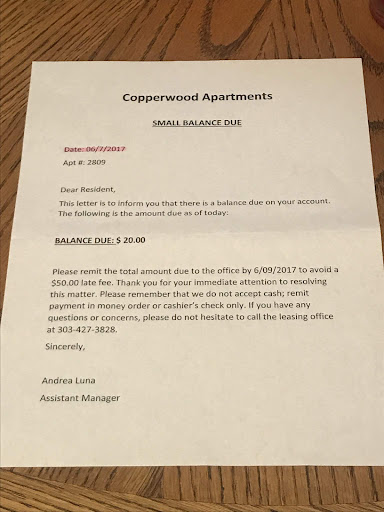 Read moreThey Deserve a -5 star and if i could i so would. They may be lost and confused of their outlined legal and ethical obligations but as a well respected Real Estate Broker in the State of Colorado I Certainly do and will gladly be informing the residents located at Copperwood. I pray for the Resignation of The Female Management Staff leaders and that Greystar Accepts it Gracefully. Seperate Complaints will be filed With DORA as well as the Real Estate Commission and whom ever else it may concern. Their staff trades unethical good for reduces in rent, retaliate at those who complain with higher fees, aggressive immoral staff i truly and astonished this has been going on as long as it has without government intervention, residents have emergency maintenance issues not being handled, let alone long standing ones, financial abuse, abuse of power, mismanaged contracts, i Hope GREYSTAR is paying attention and offers a much needed performance review i am unaware if the Female Management Staff Members are uninformed of theire responsibilities and obligations or just blatantly negligent but either way they will gladly be met with the fullest extent of litigation they can be met with. I hope future resident applicants read these reviews and come to an understanding that you will not have a Safe, secure, reliable, environment at copperwood There are Break ins, carjackings, endless damage, laundromats that dont work that get stolen from and broken in, a disgraceful amd disrespectful childish Management staff , shootings in the parking lot where stray bullets hit the cars and alarms go off all nigh, "secure" gates that are opened all day, rats, neglected residents maintenace issues horrible appliances and ammentities and truly disgusting hospitalit. Complete disregard for residents and abuse of power i hope Greystar understands that many of your clients are unhappy with the management youve chosen and theyre asking you to make it right so please stand with them through this and in the meantime i will continue to inform residents at copperwood of their rights and will gracefully offer litigation to provide governmemt intervention and investigations into the staff and management of Copperwood Apartments the corrupt and illegal actions they are partaking in will be met with strict accountability. Residents are unhappy and will continue to be so under this corrupt leadership i am disgusted that this has gone on so saddened that the owners turn blind as this occurs hopefully now eith these new legal forms they...