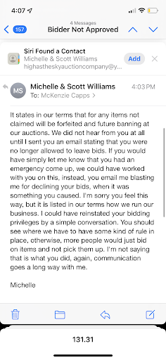 With the new online auctions, most companies have alotted at LEAST one pick up time on the weekend yet not this company. Despite the weeks I bidon items, I was admitted to the hospital for emergency surgery the first day of pick up (Tuesday) and did not have an opportunity to share these details with the auction heads. instead of contacting me in an appropriate manner I was told I could not participate in anymore auctions due to being disabled at the time. Allow me to note the fact the items I bid and won on were minuscule compared to the large items in this auction. (battery operated weed eater & leaf blower) Even if i wasn’t in the hospital, people have jobs and are most likely bidding from out town. DO BETTER