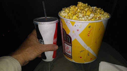 Nice little small town theatre that shows a single movie, changed weekly. The movies are shows thathave already been out a few weeks at the large theatres in major towns, but that helps keep the cost down. We paid a 'seniors' price on a Friday night of $5.50. A large ( huge) bucket of buttered popcorn and two large drinks were the daily special of $4.00 total! One evening showing daily, except in Friday and Saturday when they have a 7:30 and a 9:30 showing. The seat bottoms slope down a little too much in the front to be really comfortable, but that's my only...