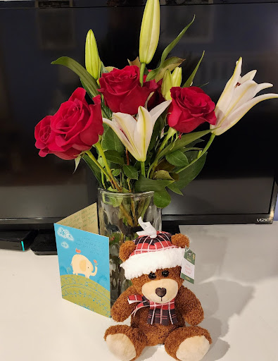 One final thing I want to add: Last week my sister Annie had breast cancer surgery. Those same three stellar staff members, Oumer, Jerri and Juana (The A+++ Team āŗļø) got together and bought her the most beautiful flowers, a sweet teddy bear and a card, and sent them home with me to deliver to her (see photo).