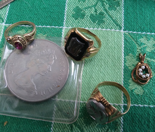We went in the morning to PGS Gold and Coin in Wheaton. You have to be “buzzed in.” Mary was VERY helpful, sweet and knowledgable. She looked carefully at all the items, discerning immediately that two rings were 10 carat gold, one was a mix of 24 carat and 10 carat and the earrings were strictly costume jewelry. The pendant was also 10 carat gold. (Interestingly,the silver chain was NOT gold, even though the clasp had the 14K “stamp” on it.) She looked at items visually, used a magnetic device and other techniques, as well as weighing everything.
