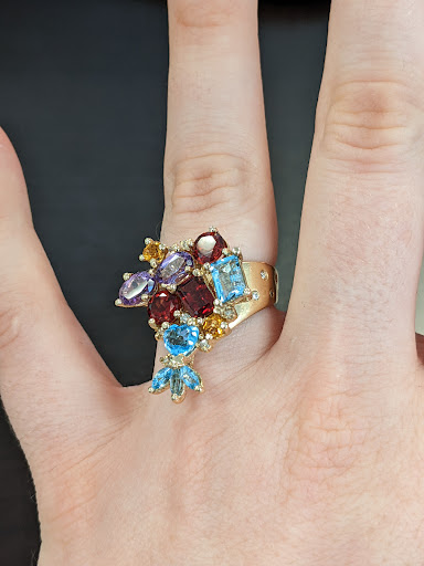 Initially I visited for a custom ring consultation which Caroline helped me design - there was a bunch of "junk jewelery" I had on the side that was never being worn, and I wanted to turn it into something unique that I could wear everyday. After consulting with her and Mariusz on the final design and modifying the wax model al couple times, my old gold jewelery was melted down and the stones repurposed into the gorgeous ring pictured. It is so beautifully made, and the quality of the manufacturing is undeniable. I get compliments everywhere I go, and the band is so well-fitted and comfortable that I can wear it all day without any problems at all!