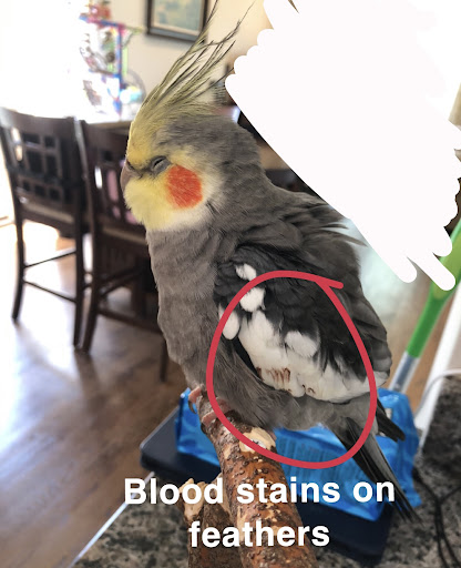 When we went to pick them up, we first noticed Disco had dried blood on her head. The staff then carelessly told us that Mochi had a “few” blood feathers and that was the cause. However, it was way worse than that; Mochi apparently had a night fright and lost ALL of his left flight feathers, and it’s obvious from the dried blood and the wound that it happened on the first few days. Also, under BOTH wings he has plucked a lot of the small feathers, due to stress and mistreatment. Thus, they were all LYING to us when we called and they said Mochi was doing very well, in addition to LYING straight into our face and not directly telling us what happened to Mochi’s flight feathers. (I was the first to say that Mochi was missing all his left flight feathers and they agreed after.)