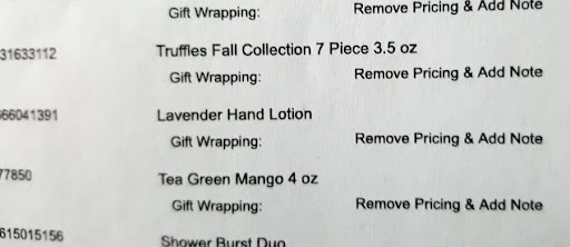 When ordering on the website, there was an option to remove the price, gift wrap and put a message on the tag. I chose that option for all the items I purchased. Once I went to pick up the order, I noticed they weren't gift wrapped. I mentioned this to the sales clerk. She said "We don't gift wrap." I mentioned the option to do so when online ordering and she said "I don't know anything about that. But we don't gift wrap." I am enclosing part of my receipt where you can see that I chose...