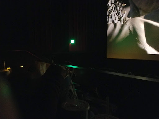 We were quickly souring on the AMC, but we'd already planned out another visit, so we went forward with that one. The next time was Alpha, and I took pictures during that one because by then I figured I was going to write something up. The screen has lights illuminating it during the opening commercials, and they left those on for the previews as well, right up until the movie itself started. I don't have some genius-level peripheral vision or anything, but the guide lights which would normally be pointed down or covered were constantly visible, glaring on either side. The exit lights on either side of the screen were so close and so bright they overpowered the projector at times, and cast a green haze across the screen the entire movie. Just like last time, within the last five to ten minutes of the movie, long before the credits, the cleaning crew propped open the exit door. This time there was just one. I guess since he had no-one to talk to, he came in and wheeled his cart over to the side and leaned against the wall. It really felt like: "You're done, right? Get out."