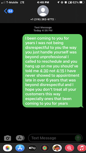 Read moreKeeping in mind my family has been coming to her for years I made a appointment at 4:15 I get there at 4:14 she said starts on somebody as soon as I get there after that’s it’s 4:26 she starts on somebody else I tell her I’ll come back tomorrow and I leave I call back to reschedule and she said starts yelling and then she hangs up on me I’m...