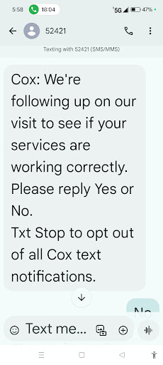 The experience was atrocious and if there were any other non-broadband options available for my address, I would cancel Cox without hesitation. If you are reading these reviews to decide which provider to use, and if you have ANY other option, use those. Do not use Cox unless you literally have no other option. And if you do have to have to use cox, good luck.