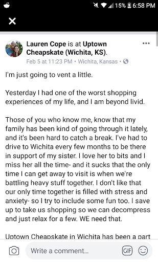 On February 4th, we had stopped by the way we do every couple months. Our trip started out well enough, my sister and I had found some cute outfits and we were trying to help our mom find some cute clothes as well. Around here was when we noticed the same associate had been next to us in every section of the store so far.