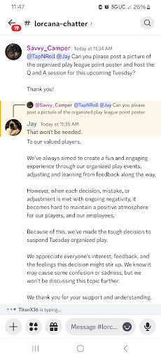 The fourth season of League was where alot morr issues happened. For one thing, the store decided to completely overhaul league and make it a weekly competitive tournament going against what Ravensburger's vision for League was supposed to be which is a casual format. The employee from season 3 announced this in the discord (official communication between store and players) the day of League. Alot of people werent happy with this decision except 2 people. Well, TapNRoll tends to double down on their bad decisions and stuck with it for one League. We finally stopped paying for League which should have been free for 3 seasons now but the owner made it sound like he was doing us a favor.