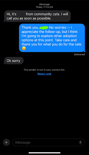 Read moreI really wanted to have a positive experience with Community Cats Organization, but unfortunately, my interaction left me feeling disappointed and discouraged. I initially spoke with a representative who gave me her business card with her name email and number. This woman promised to follow up with me the next day. That call never came. I tried calling twice later in the week and even left a polite voicemail — in the midst of my voicemail it was abruptly ended. A few minutes later, I received a brief text saying she’d call me “as soon as possible.” So this is the first I’m actually hearing from her. When I kindly let her know I’d be pursuing other adoption options, her response was simply “Ok sorry.” For someone representing a rescue organization, that kind of communication is dismissive and unprofessional. When I expressed my disappointment respectfully, the reply I received was, “I’m sorry if you feel that way,” rather than true accountability. I completely understand that rescues are often busy and run by volunteers, but good communication and empathy are just as important as the work being done for the animals. Experiences like this can discourage families from adopting through rescues — and that’s the last thing anyone wants. I genuinely hope the organization takes this feedback as an opportunity to improve how they communicate with potential adopters. My name is...