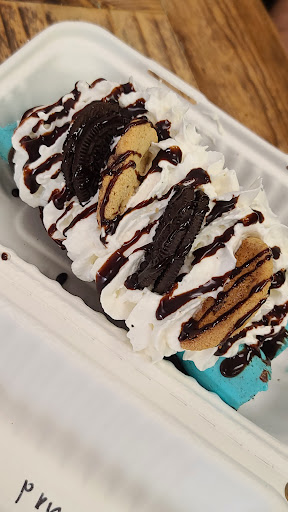Walked in the door on my first visit & the first thing I notice is a smell that dreams are made of. I was told it was the waffle cones (I knew at that moment I would order one). Next, I got a dose of a very friendly staffā” Seems to be family owned, with kids sitting to do their homework & the sweetest young lady helping us at the register and answering questions for us. This made me fall in love with this establishment immediately. I ordered the Monsters Inc. It was vanilla ice cream (with a super fun blue color) with a chocolate chip cookie and oreo cookie rolled together and sat inside a delicious homemade chocolate waffle cone shaped like a large taco shell, and topped with whipped cream, chocolate drizzle, and more cookies! As I watched this concoction come together, I felt like a kid on Christmas morning. It was really quiet neat to watch the whole process! We got our order from a very friendly lady who seemed happy to be right where she was, what a breath of fresh air to see that these days. Then we get to sit down and try it out. I am not a huge fan of ice cream, However this is definitely not your typical ice cream and I absolutely loved the dish. Soooo goodš On our way out, staff spoke to us again, making sure we enjoyed our visit & we did very much so. I'm thinking maybe these were the owners that we had the pleasure of meeting today, regardless every person we came into contact with was helpful & friendly! I would definitely recommend trying them out, you will not be disappointed!!