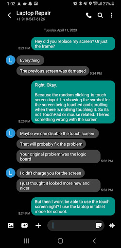 So I had to disable an integral part of my laptop, that wasn't broken when I gave it to him, because he replaced my screen because "it looked new and nicer." The fact i wasn't charged is irrelevant because he BROKE my laptop in a way it wasn't broken, I didnt ask him to fix the corner in the first place, and I havent been able to use my touch screen in over a year. I had to buy a tablet to do the thing my laptop, that I paid for with a touch screen feature, should've been doing because it was cheaper to buy a tablet than to fix the broken touch screen.