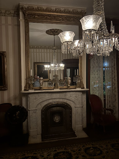 The house has 14 rooms, around 600 original items such as furniture, dishes, sculptures, in fantastic shape, as they had never been taken out of the shipping containers. The family tree was unique on the wall. You can even see where the original carpet was worn away. The house has a Victorian-style decor with a marble fireplace, velvet curtains, and intricate chandeliers. The walls in the foyer are painted to look like wallpaper. I enjoyed seeing all the photos.