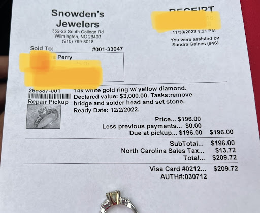 Read moreMy name is Jeff. I am a local business owner in Wilmington and I ALWAYS keep my business local. I needed a necklace repair over a year ago and somehow I ended up at Snowdens. I was pleased with the service I received at that time. Fast forward a year and here I am in need of a necklace repair again today. I came back to Snowdens. I am in the parking lot making this review. Customer service is HUUGE to me as I own and run a service based business myself. I couldn’t be happier with the service I have received not once, but twice. Today I dealt with Colt. He greeted me when I entered and did everything possible to get me fixed up as quickly as possible and keep me a happy customer. He explained all of my options. The particular pieces that we needed were not in stock so he is ordering the correct parts to repair my necklace. Rather then end here, he decided to fix it immediately with a part that is gold plated to hold me off till the correct parts come in. He remembered how important this necklace was to me as I inherited it from my deceased dad. He knew how bad I wanted to wear it today so he went above and beyond. Again, customer service is HUGE to me and I couldn’t be happier with my experience today. Snowdens Jewelers and Colt are wonderful. I highly...