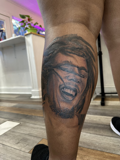 Bryan made my tattoo dream come true! I fell in love with this photo of Bob Marley the first time I laid eyes on it, and it immediately became the tattoo of my dreams. I always said that I would wait as long as it took to find the right person to do this tattoo for me and I truly believe that Bryan was supposed to do it! My wife and I found this place randomly while looking to do some tattoo therapy after a rough day at work, and in the process of getting separate tattoos, I found out that Bryan does portraits. It was fate! The research and planning and care that went into it warms my heart every time I think of it. The fact that he has been so excited to work on it just takes my trust up to the next level. This is only after session number two! We have plans to do more work on it simply because Bryan wants to make sure he sees it from every angle, including after it’s been healing for a while. I have felt so comfortable every time that I’ve gone to this shop, and as I have said each time I’ve left, they are, “stuck with me for life now!” I will recommend this place to any...