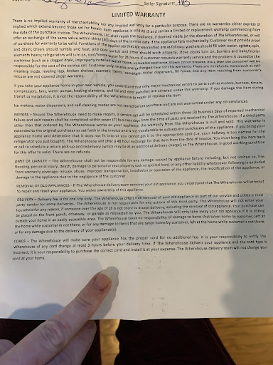 So I hang up with him and immediately call the wherehouse store line. The same woman answers the phone. I tell her about my conversation with the tech guy and she says that since we picked it up we would be responsible for bringing it in. If they had delivered it then the service fee is covered in the delivery fee (which makes no sense bc delivery fees cover cost of gas and labor for said delivery in a normal world). Well thatās just great but you arenāt offering delivery so how does that factor in?