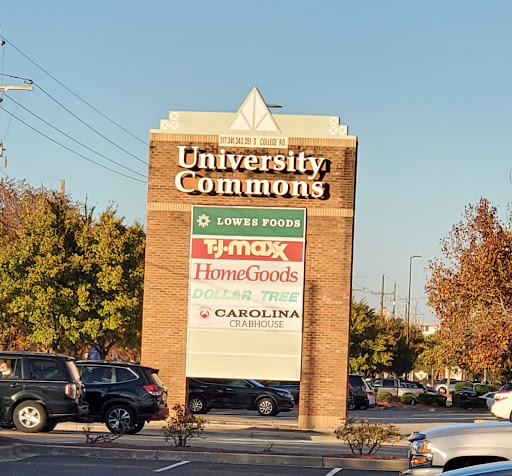 University Commons is located at the corner of South College Rd. and New Center Dr. It's very convenient for UNC W students. It opened in 1989 and was renovated in 2007, it's starting to look like it could use some freshening up. It's an open shopping mall that covers a big area and has about 30 stores, restaurants and businesses. Everything from AC Moore to UPS. There's pizza, BBQ, sandwiches, Mexican, Asian, and coffee shops. A Home Goods, TJ Maxx, grocery store, shoe store, nail place, hair place. Just about anything you need, but you have to walk outside and the parking lot can be a challenge at times, especially at the Honeybaked Ham store...
