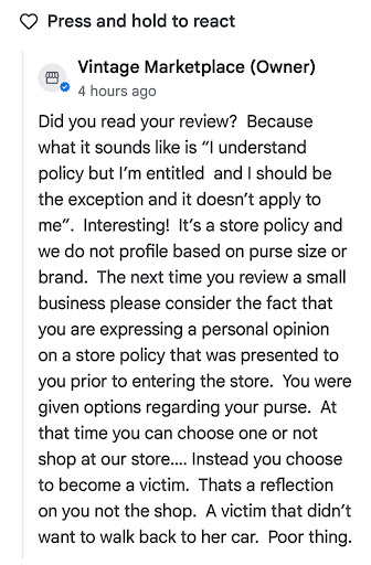 Read moreUPDATED REVIEW : We recently visited a vintage marketplace over the weekend and were instructed to place our child's small backpack into a locker. I completely understand the concern regarding a bag potentially knocking over valuable items, and I recognize that this business has unfortunately faced issues with theft recently. Therefore, it is entirely reasonable for them to enforce such rules, as it is their establishment and we are merely guests. However, what I found unacceptable was being followed around the store by another employee; that constitutes profiling. I assure you that I have no intention of stealing anything from your store or any other store for that matter. Please do not let my tattoos deceive you or judge me based on appearances! I operate my own antique business as a reseller, and my home is filled with antique treasures and collections; I am a passionate collector! It was quite shocking to witness the situation unfolding before me, and in my opinion, it was extremely unprofessional! UPDATED Regrettably, I am unable to reply to your response on Google! It appears that you did not fully comprehend my message! I am not referring to the incident involving the backpack; I explicitly stated that I understand your desire for customers to store their belongings in a locker, and I concur with that! My concern pertains to another employee who followed me around, which I clearly articulated in my review! I believe it is unjust for you to selectively address certain points while ignoring the entirety of my message! That gentleman, who is my husband, felt particularly singled out upon observing three other women carrying purses, which I believe would evoke similar feelings in anyone, thus justifying a sense of victimization in this context! I merely recounted my experience—perhaps instead of being overly defensive and quick to retaliate against someone who was polite, respectful, and understanding of your shop's rules, you should consider accepting constructive criticism! It is a fundamental human right to voice one's negative experiences within a professional...
