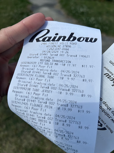 I walked into this store on April 25, 2024, and I fell in love with the dresses! I was greeted by an employee who mentioned she had been working there for 7 (or was it 5?) years. She was marvelously polite, enthusiastic and helpful. I loved the classic hip hop & r&b music they had playing in the store while I shopped. “We have Pandora playing!,” she mentioned. I was there late in the day, from 7 pm until closing. There were a couple other employees there. Now, I returned Saturday afternoon around 4 pm all dolled-up wearing a dress I purchased from this Rainbow store; to my surprise, none of the 3 or 4 present employees acknowledged it. I did not see that single cheerful employee (I came to realize she was the only truly welcoming employee). I honestly felt uncomfortable given the present employees’ apathy. Anyway, I returned to purchase another dress, and I also attempted to return several I purchased Thursday as they were too long (it’s bizarre to me Rainbow’s fitting rooms aren’t operational—we’re past COVID, people). However, I didn’t have the physical card on me, and the return was not possible. To my disappointment, I was forced to return to this unpleasant environment one last time today (April 28, 2024) with my card handy to receive my refund. The single employee with amazing energy was absent again. A heavy-set woman with cornrows wearing all black ran my transaction (see attached operator user id), and again, I felt un-welcomed. She was unmannerly, didn’t smile once, and gave the impression she was annoyed (sighs). I was disgusted, sincerely, because albeit the store is organized and clean, the majority of employees lack regard for their...