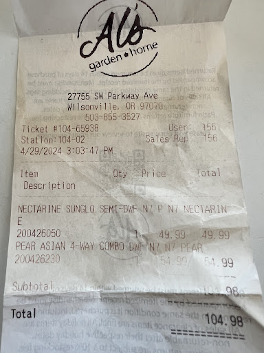 Read moreThey are not the experts, I went to Al’s as it was highly recommended. Sadly I was scammed. I went in April seeking a nectarine fruit tree. The tree I chose at the time had barely distinguishable small tiny fruits. My receipt and the tag all say nectarine… I came home planted the tree did my best to care for it and it’s thriving. Sadly it’s clearly a peach tree. I don’t each peaches I specifically wanted a nectarine tree. At first I genuinely, not knowing anything, assumed the fuzz was a common thing for the first stages of the fruit. After I researched, that is clearly not the case. Even the tag says “smooth skinned” I now am stuck with a peach tree when I do not like peaches. Do your own research ahead of time don't make there same mistake I made, as they...