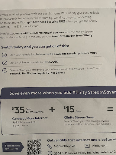 Read moreWent in to the store to add TV service to my account so I wanted to bundle it with my internet. I asked Junior about bundling my services. He was having a little trouble getting me setup which is understandable. When he asked for help he stepped away from the computer and got straight on to his phone like it was more important. After every was finished his end you always have to go through the agreement process sent to you via text. We had to do this a few times first it was $221.05 then last time it was sent it was $245.10, I asked him about it and he did not respond “it’s just a estimate” he said. Come to find out he charged me for 2 TV box’s which I are $10.00 then deleted my unlimited internet data without my consent. I have went to this store for a second time an it’s always the representative Junior that I have issues with because he acts so careless. If you need assistance in store you’re better of going to the Xfinity store in Martinsburg, WV 20 miles away from this store. Because nobody seem like they actually want to help the customer. Luckily I called customer service they removed the extra box and brought to my attention my unlimited data plan...
